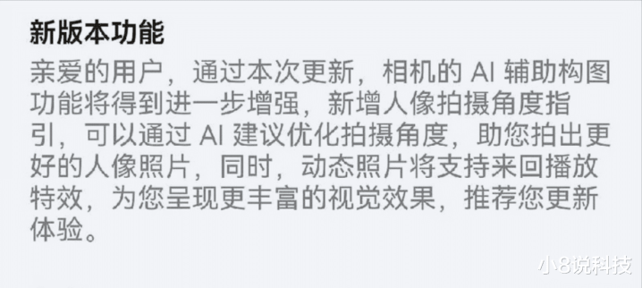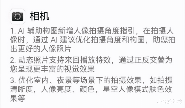AI人像构图辅助、动态照片来回播放、夜景优化、室内拍摄修复、方舟引擎系统底层稳定性提升……